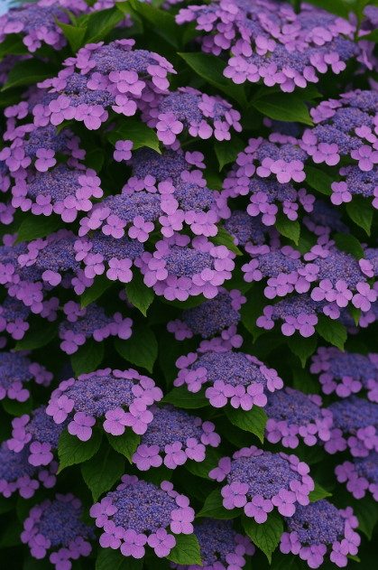 작지만 단단한 꽃이 풍성히 피고, pH에 따라 색이 달라집니다.