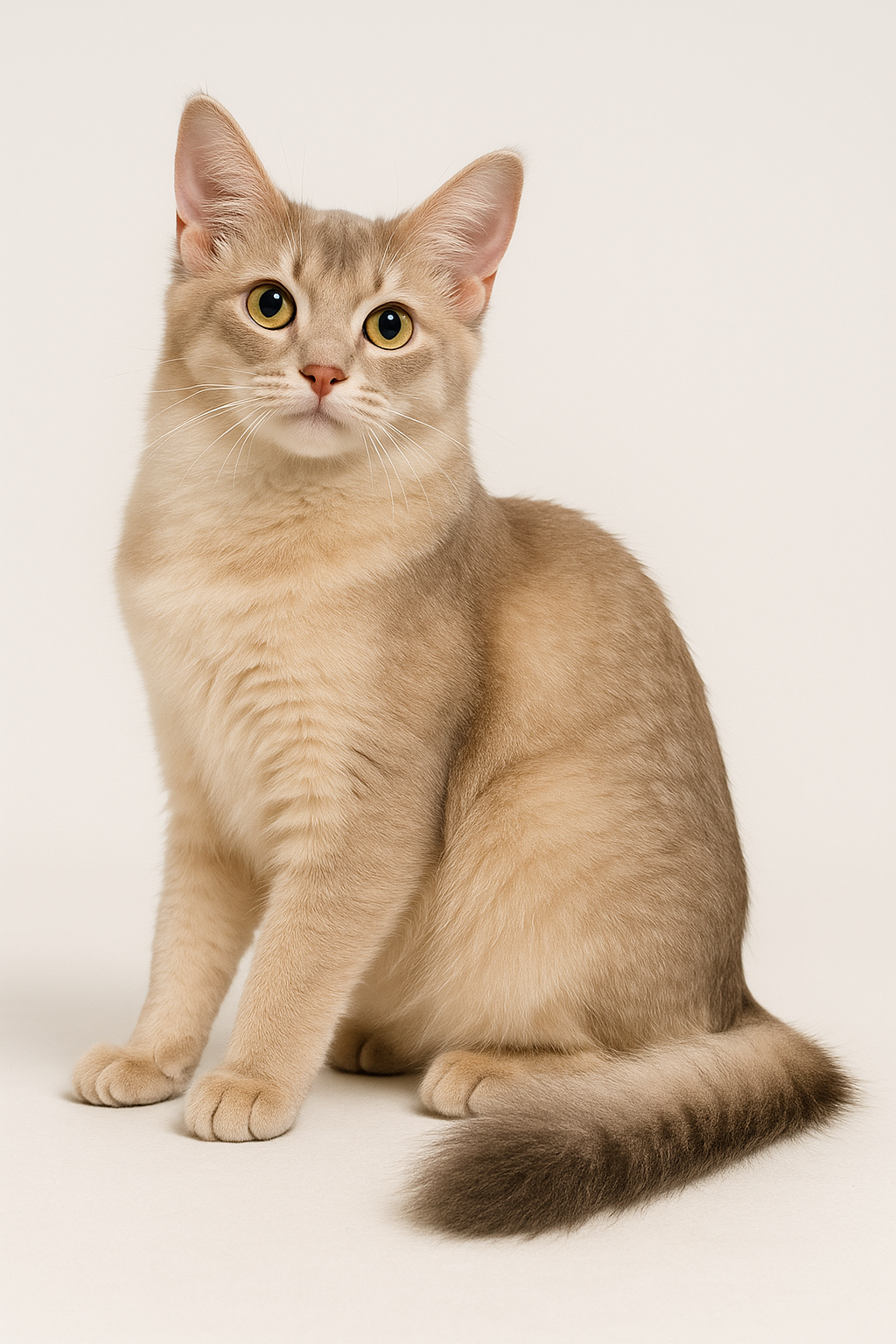 털에는 오트밀 컬러와 분홍빛 베이지의 줄무늬가 있고, 꼬리 끝은 더 짙은 분홍빛 베이지로 포인트를 줘요.